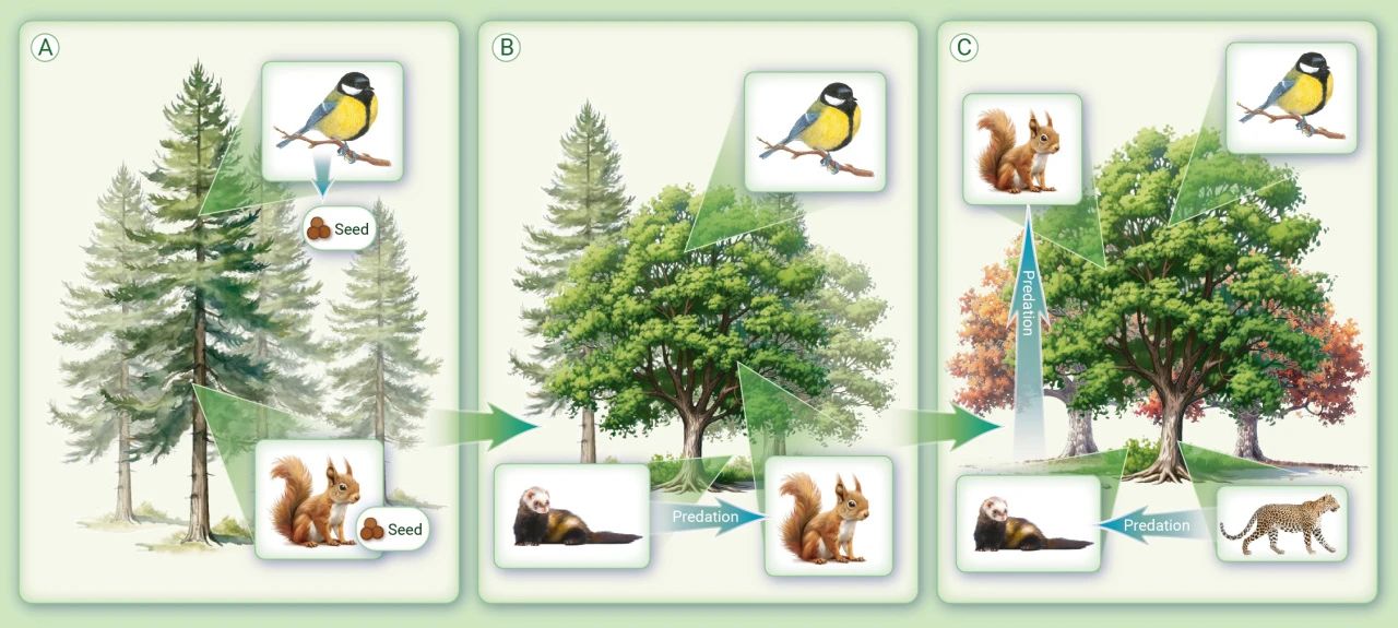 中国的人工林正在生态平安方面起到了主要感化,但也存正在如下问题:品种和布局单一,以中长龄为从;林下缺乏两头灌木层和地表植被;大量利用外来种;不如天然林布局复杂和功能不变;较少利用珍稀濒危动物。中国打算到2035年实现P规模某人均收入程度正在2020年的根本上翻一番。考虑到社会、经济和生态的协调成长,中国的生态系统办事功能也要加强。因为天然林提拔空间不如人工林大,因而,能够考虑通过天然发展加人工干涉的再野化体例,推进人工林向近天然林演替,以供给更多的生态系统办事功能。能够向生态、经济、社会多种功能效益最大化改变,不竭提拔生态系统多样性、不变性、持续性。能够调整林冠层品种、林下品种,将外来种改换成乡土种等,再通过种子、多层化、多样化实现再野化。正在人工林为近天然的生态公益林的过程中,要从以植被恢复为从,转向留意动物群落的恢复,恢复丛林生态系统的养分级,最好是能恢复丛林群落中的动物(图1)。正在山川林田湖草沙管理过程中,该当操纵系统的概念,将工做沉点从生态系统标准转向景不雅标准的恢复,注态系统间的畅通性,恢复活态连通性。提拔生物多样性和恢复程度,添加人工林减缓天气变化的韧性。正在此过程中,要加强科技立异工做,包罗乡土动物、高价值动物的研究;要分析考虑动物的当场、迁地、加大动物生态人才的培育,通过空间规划实现景不雅标准的生态廊道的恢复。